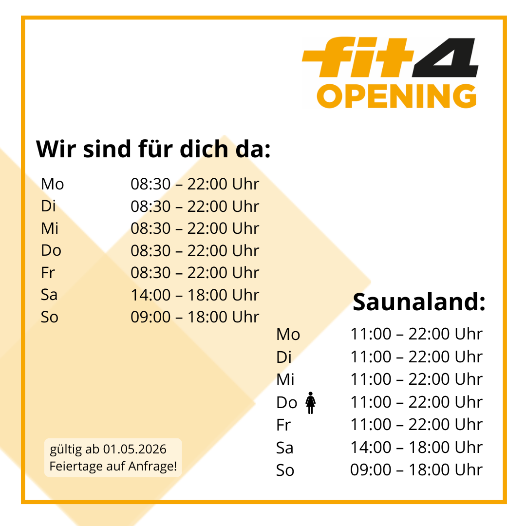 Zeige grösseres Bild Neue Öffnungszeiten! Ab diesem Samstag (02.05.26) ändern sich wieder unsere Öffnungszeiten! Samstags sind wir ab sofort über die Sommerzeit wieder bis 18 Uhr für euch da! Die restlichen Öffnungszeiten bleiben wie gewohnt bestehen! fit4life2026-04-27T12:19:29+02:00