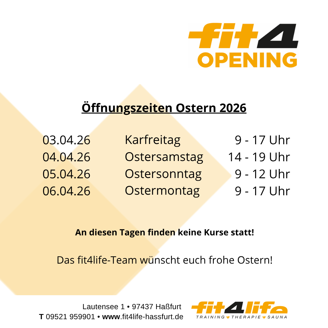 Zeige grösseres Bild Öffnungszeiten Ostern 2026 An diesen Tagen finden keine Kurse statt! Wir wünschen euch schöne Feiertage! fit4life2026-03-24T20:11:47+01:00